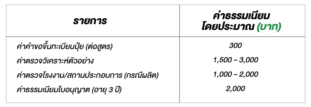 สรุปค่าใช้จ่ายรวม: โดยทั่วไปอยู่ที่ประมาณ 3,000 – 7,000 บาท ต่อสูตร ขึ้นอยู่กับจำนวนตัวอย่างและการตรวจโรงงาน